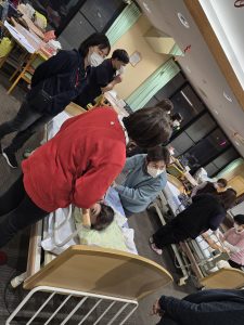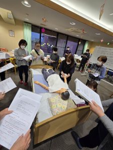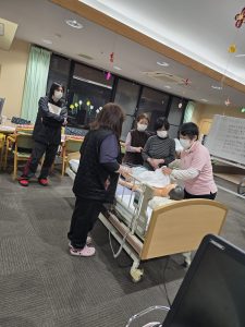 勉強会では、ベットで寝る方 清拭をされる方と分かれて体験をしてもらいました。