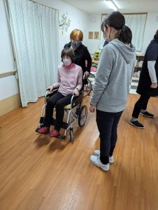 車いすの操作・ティッピングバーを使用して段差介助の練習を2グループに分かれて