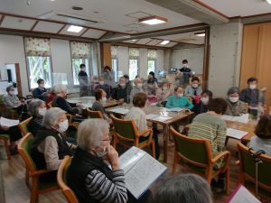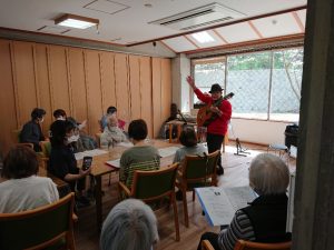 今回は愛音の会からアントニオ利根川さんと順々さんにお越しいただき、ギターとオルガンによる演奏を披露いただきました。ケアハウスご入居者、デイサービスご利用者、職員のご家族も交えて40名を超える方々が食堂内での演奏を楽しみ、演奏曲のなかには「ふるさと」、「さくら」、「瀬戸の花嫁」など皆さん御存知の曲ばかりで、素晴らしい演奏に合わせて14曲を熱唱。