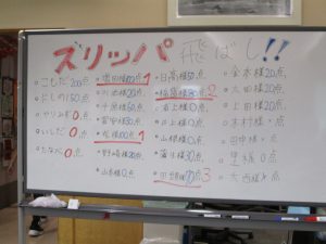 名付けて『スリッパ飛ばし』ゲーム!!枠の中にスリッパを飛ばし点数を競いました!!